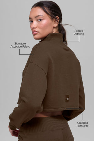 Elevate your post-workout look with the Cropped Serenity Coverup. With its ribbed mock neck and oversized, boxy silhouette, this style is the perfect piece that works for every recovery moment. Pair it with the Serenity Sweatpant for a chic outfit.