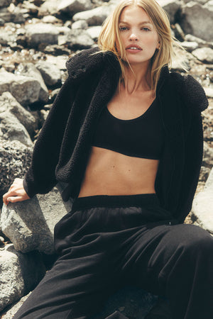 Done in plush sherpa, the Foxy is your new go-to layer. It has a removable hood, a tall collar, a front zipper and cozy ribbing at the cuffs and hem. Fitwise, it’s relaxed with a hip-length hem. Wear it with a cute skirt on the weekend, with sneakers to catch a flight, or over a matching set to walk to your workout. Seriously—it’s that versatile.